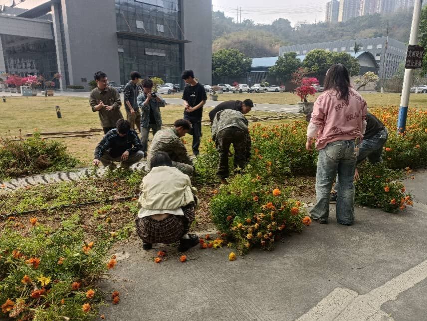 实践环节在春日暖阳中拉开帷幕。来自经济与管理学院的同学们齐聚花田边,认真聆听环境服务中心副经理讲授万寿菊的相关知识。从植物特性、生长周期到园林应用,深入浅出的讲解让同学们对眼前这片花田有了更深的认识。随后,在绿化队老师的现场示范指导下,同学们分组投入劳动实践。大家俯身田间,小心翼翼地采摘成熟的万寿菊种子,仔细拔除枯萎的植株与杂草,挥动锄头翻松土地。现场分工有序、配合默契,欢声笑语与劳作身影交织成一幅生动的春日劳动景象。